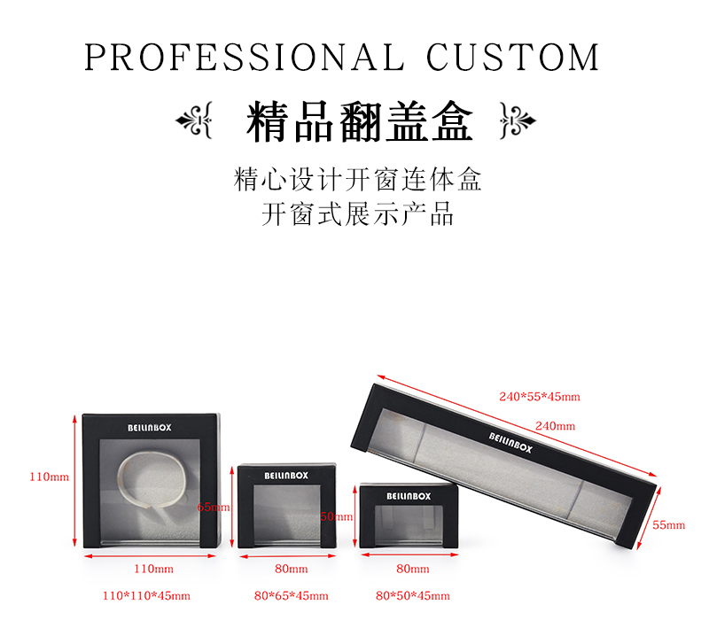 饰品盒定制,精心设计开窗连体盒,PVC开窗式展示产品,使用PVC翻盖设计。可选工艺材质定做,定做项链,手镯,对戒盒等款式,可选择冠琳首饰盒厂家可根据客户需求进行定制饰品盒,从客户角度出发,制定首饰盒生产方案。冠琳包装盒厂家,饰品盒制作质量保障,工艺精湛,同时可定做纸袋布袋。 |