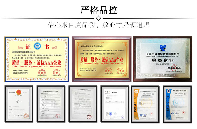 齐全的资质认证保障包装盒高品质 ● 通过ISO9001质量体系认证,制定严格的品质管控流程和标准,并要求生产过程严格执行 ● 获得进出口经营权,企业有资质有实力,产品精品高品质。 ● 冠琳使用的所有材料均有环保证明,冠琳包装盒高端、环保、时尚