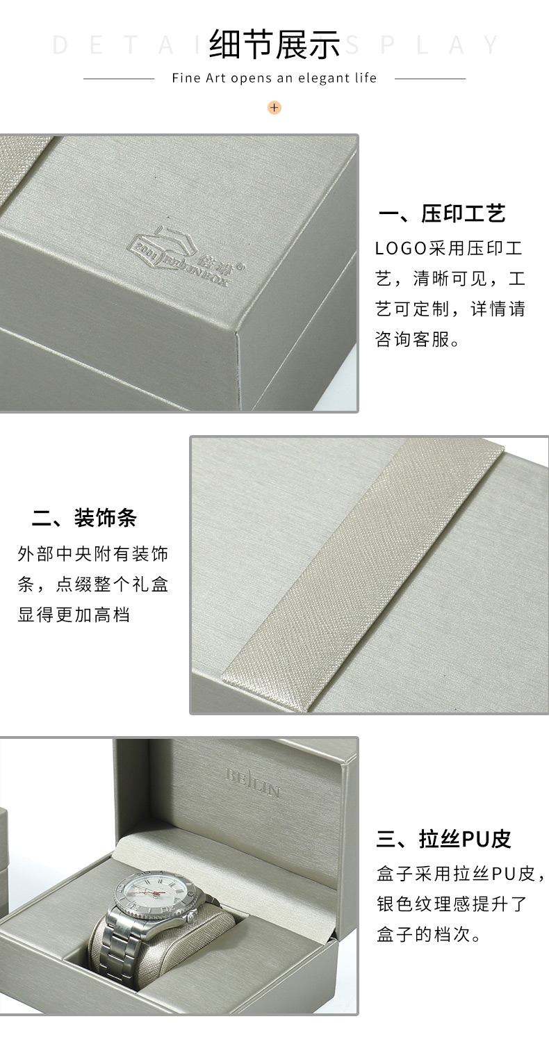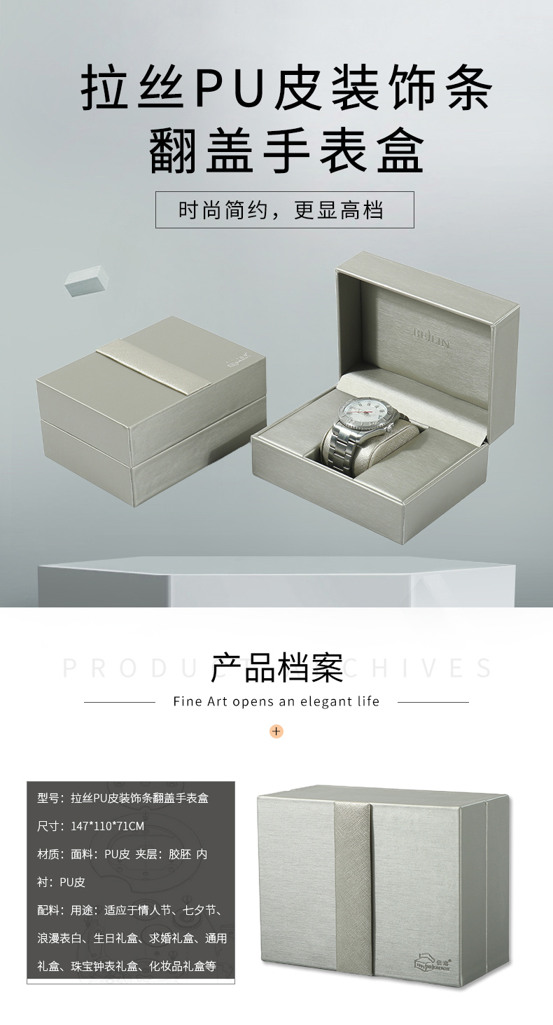 皮质手表盒,拉丝皮优选面料。冠琳皮质手表盒包装生产厂家,可根据品牌商产品文化理念以及包装预算的推荐合适里层材质如铁质、木质、纸质、胶质,根据手表盒子包装设计推荐合适的内托材质和表面材质(如皮料、纸、绒、布等)。手表盒制作,大型工厂车间,丰富经验师傅做工精细,产品全检,保障品质。 |