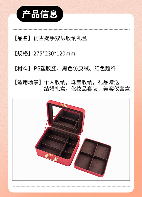 • 适用:化妆品,珠宝,礼品,手表收纳,结婚礼盒,赠送礼盒