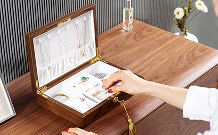 首饰收纳盒的款式丰富,而在市场上常见的首饰收纳盒就是珠宝盒,可放置不同大小类型的珠宝首饰,项链,耳环等。它的外观造型精美,内部用多间隔式设计,主要能防尘、防潮,防氧化,也能防止首饰接触带来划痕,起到保护首饰的作用。部分的珠宝盒采用的是特殊形状,或者特殊的材质制作,例如皮质,皮质的珠宝盒设计混合时尚和古典元素,反而有一种浓郁的现代气息。或者木质珠宝盒,实木或中纤板制作而成,经过雕刻之后的珠宝盒,有种古朴幽雅的气质,适合品味高雅的女性。