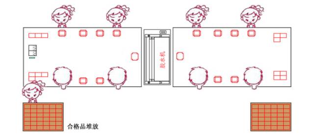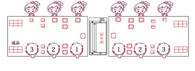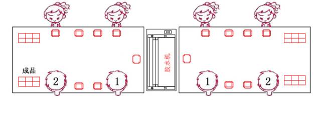 如人手充足可3人一组,一机两桌,12人4组。适合生产工序较为多的礼品盒。一人完成一工序,提高生产效率。
